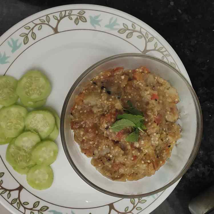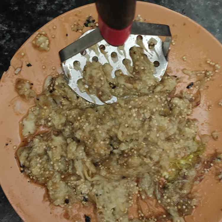 Baigan has to be roasted from all side otherwise it will not get mashed properly. When get roasted leave to cool down. Take out green chillies and ginger from baigan and crushed it . Now they are also roasted so can be crushed finely. Now peel off the baigan and mash it Add green chillies, ginger,amchur and salt also.
