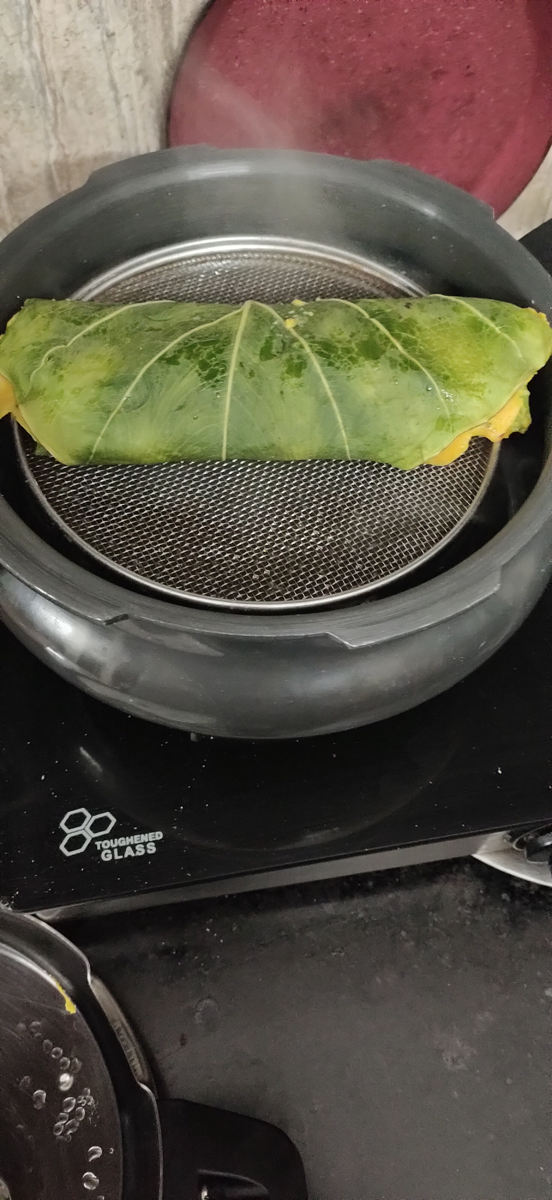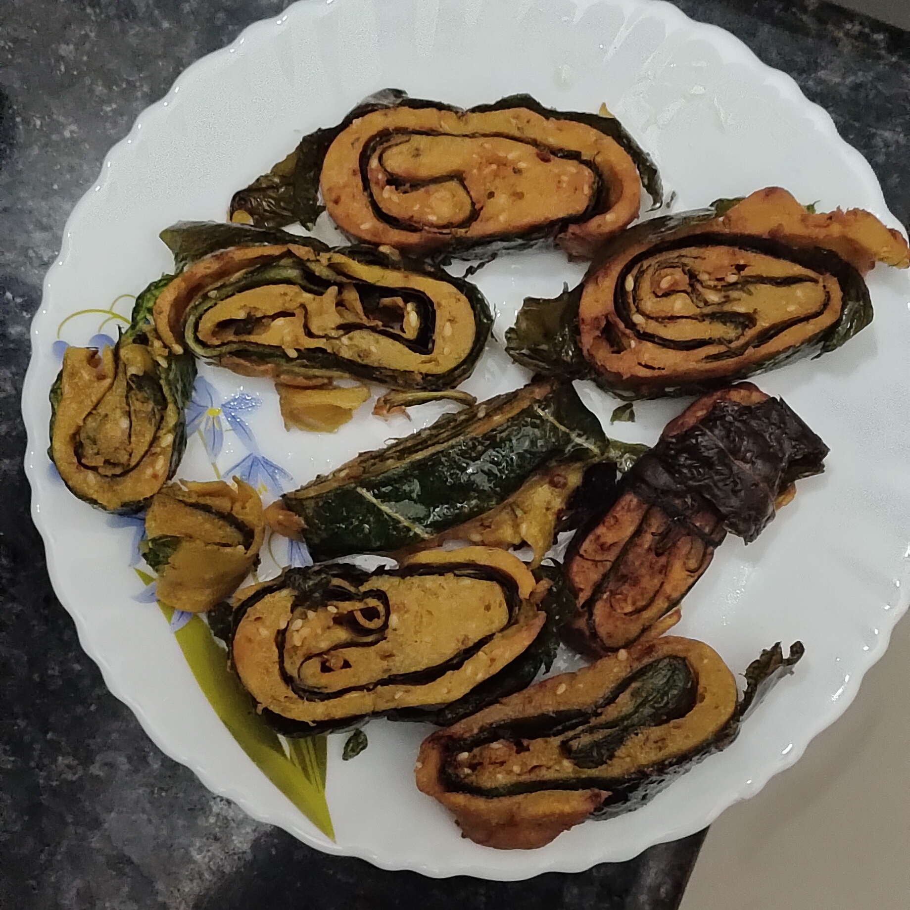First of all prepare the marinate take gram flour in a bowl add salt , red chilli powder, jaggery powder, seasame seeds and carrom seeds.now pour water to make thick paste to marinate leaves.Place first leaf on the surface and marinate it .place another leaf over marinated leaf and marinate this leaf too. Now roll the leaves properly and steam it.
