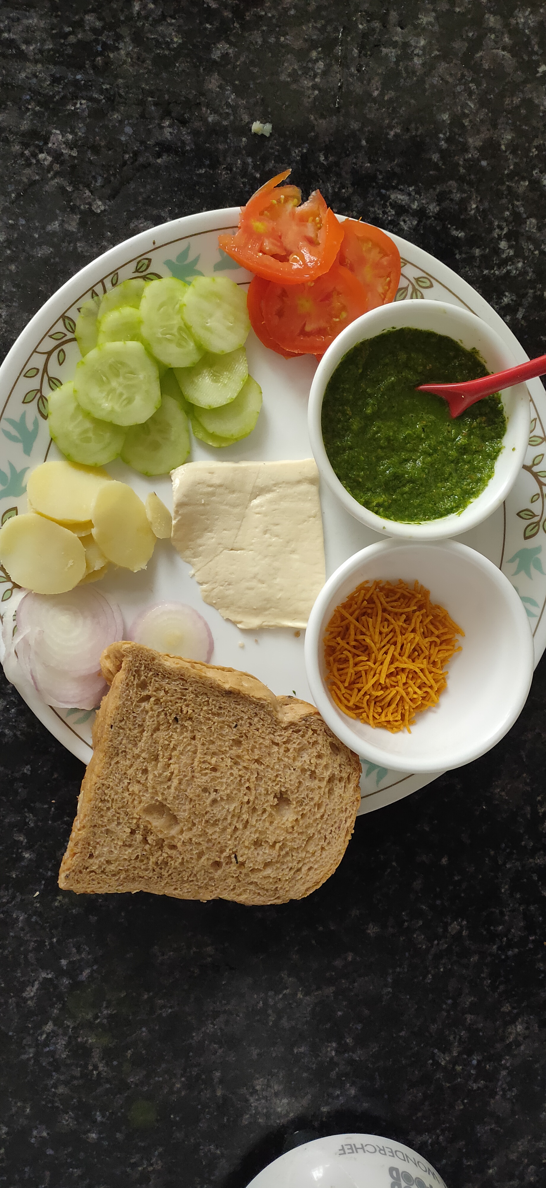 - 1 very small tomato, boiled potato, onion, 1/4th cucumber (all thin sliced)