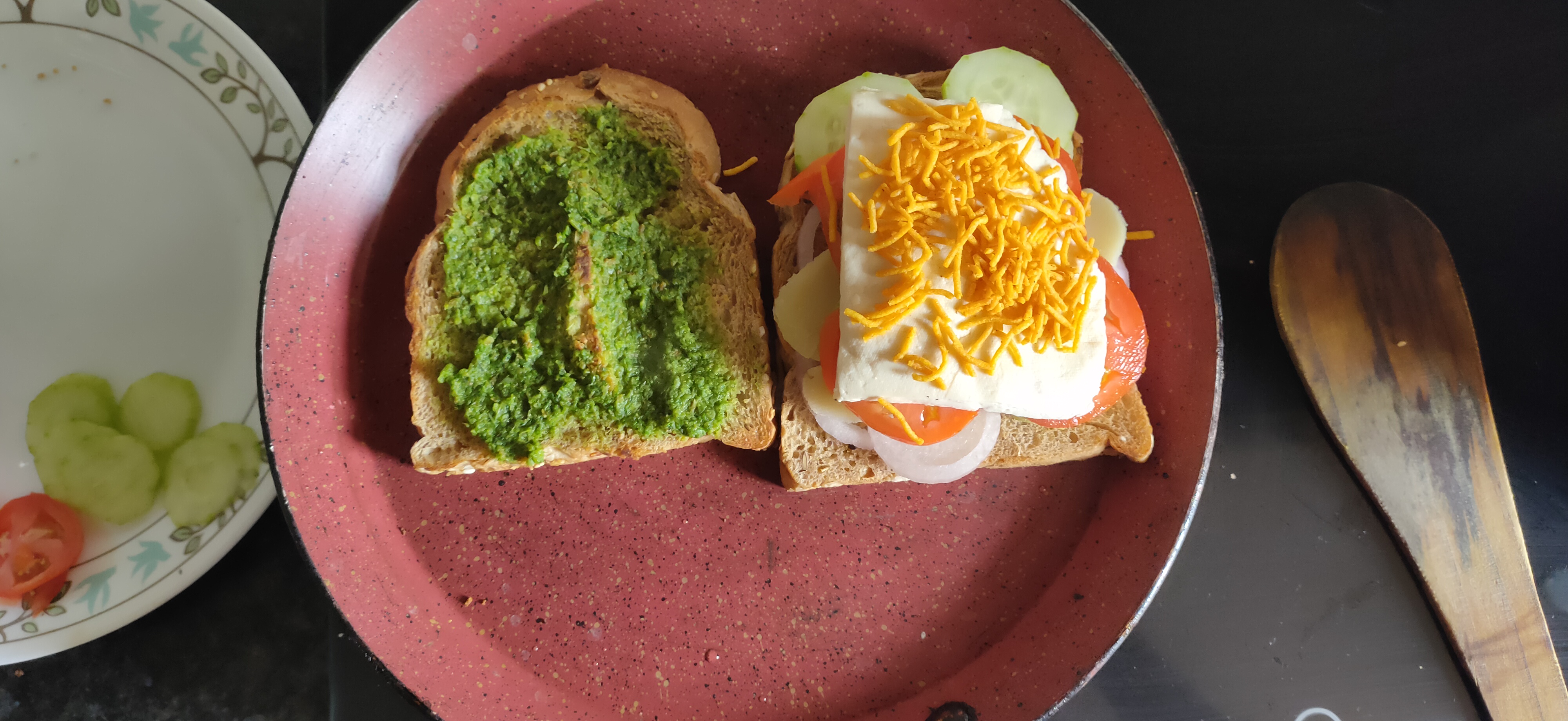 First put the thick bottom flat pan over the flame. Put bith slices of bread to toast a little from both sides. Apply desi ghee at one side of both slices. Flip slices and apply green chutney over one of the slice and arrange other ingredients (all sliced veggies) on other slice. Now put soya cheese over veggies and then bhujia. Sprinkle pepper. You can sprinke salt also but very little because some of the ingredients are already salty. Flame will be at sim in the whole process.