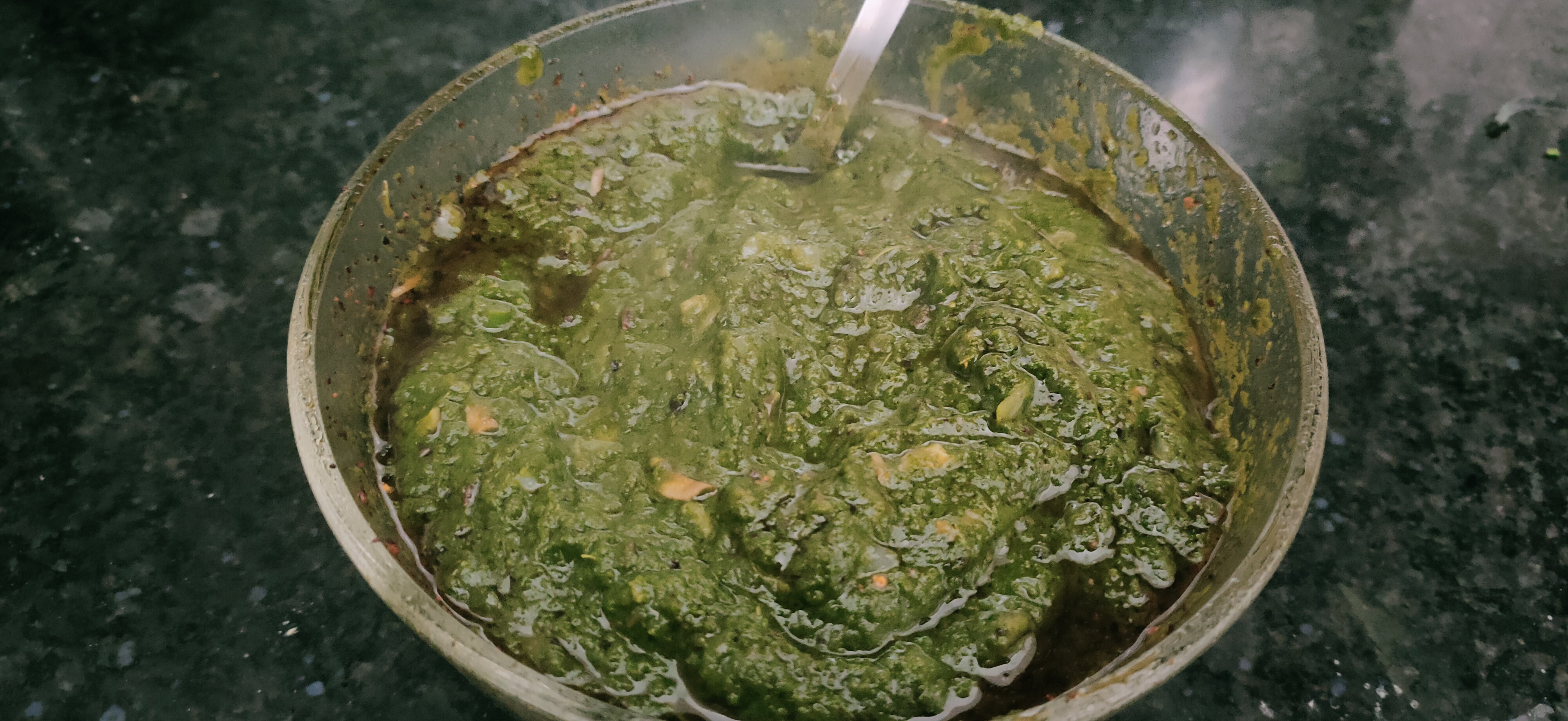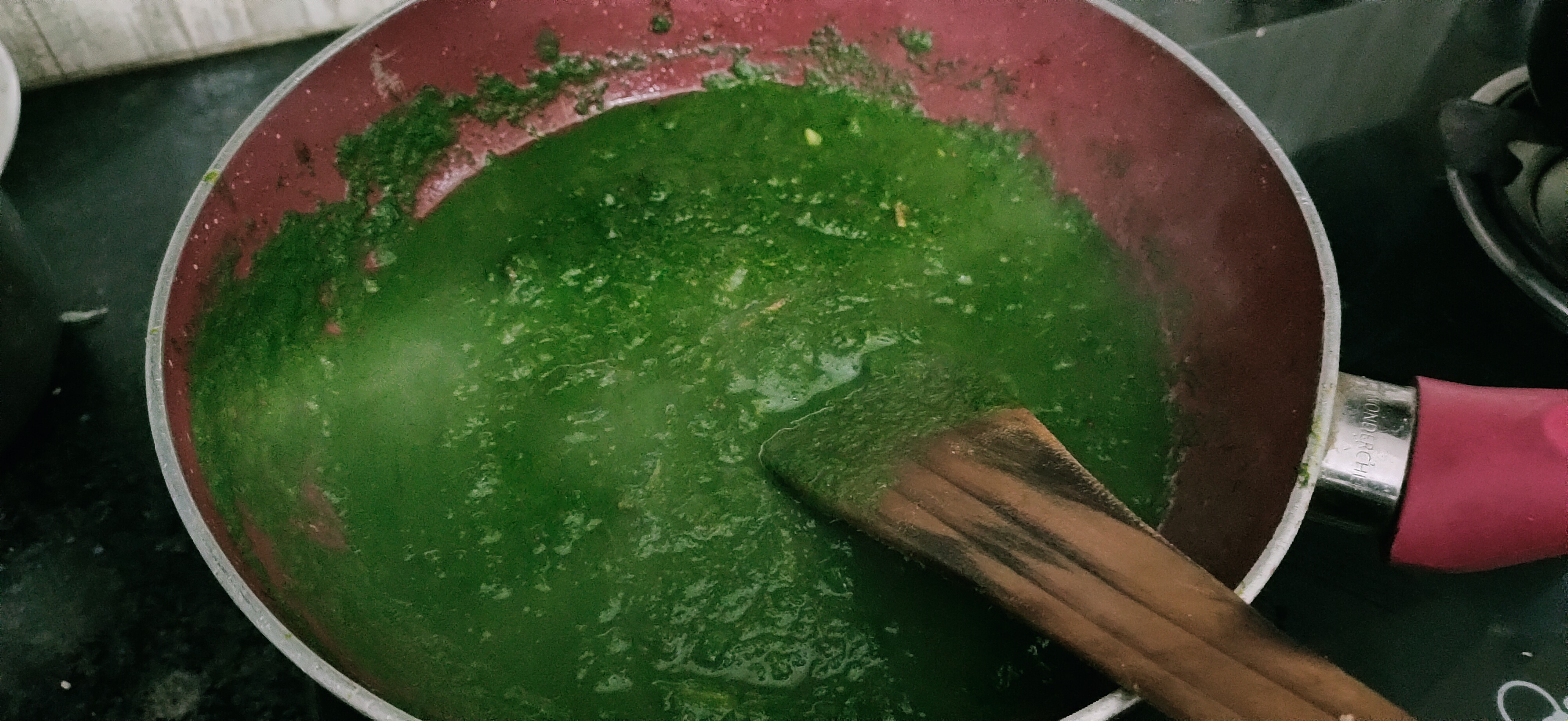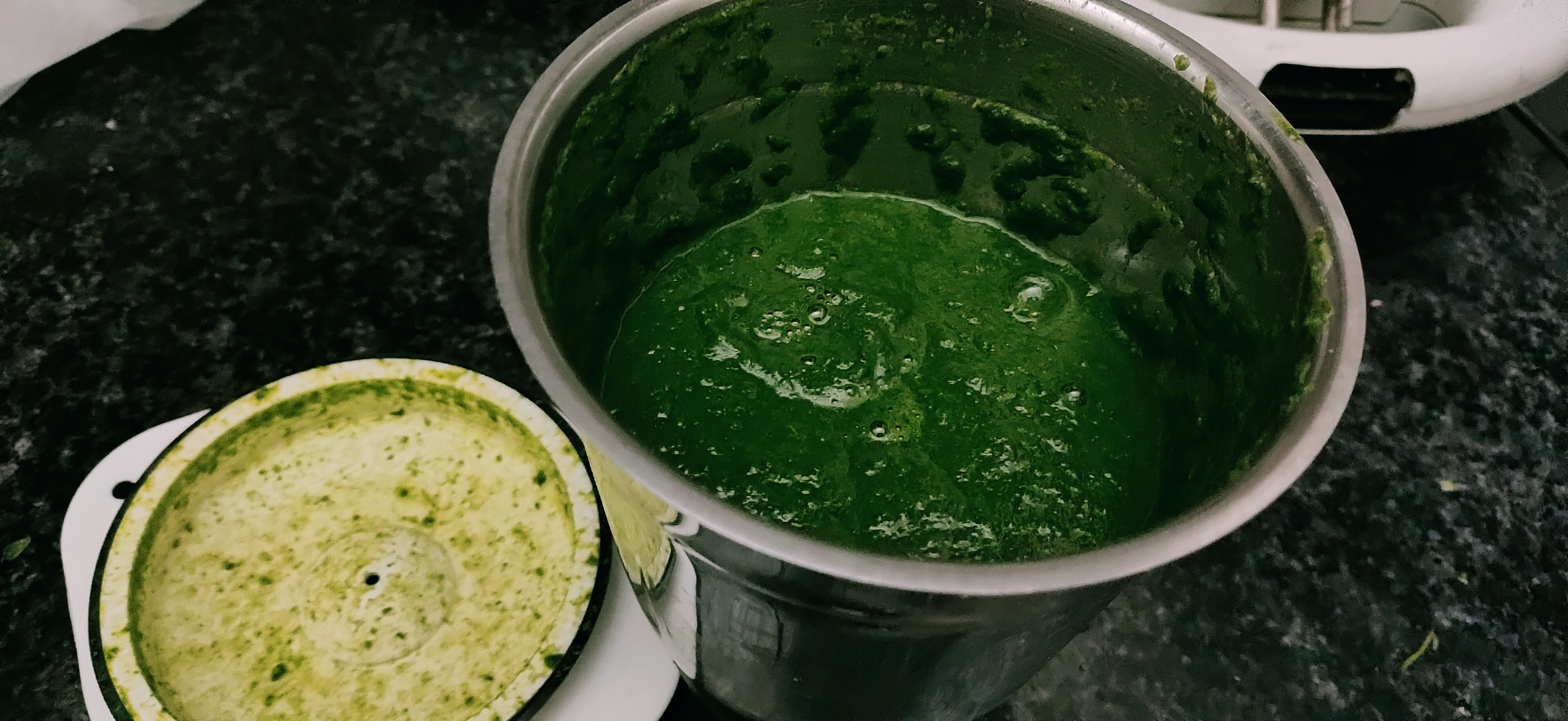 First cut all the leaves coarsely. Boil them in very little amount of water for 10 mins. Let it cool. Make a fine paste.