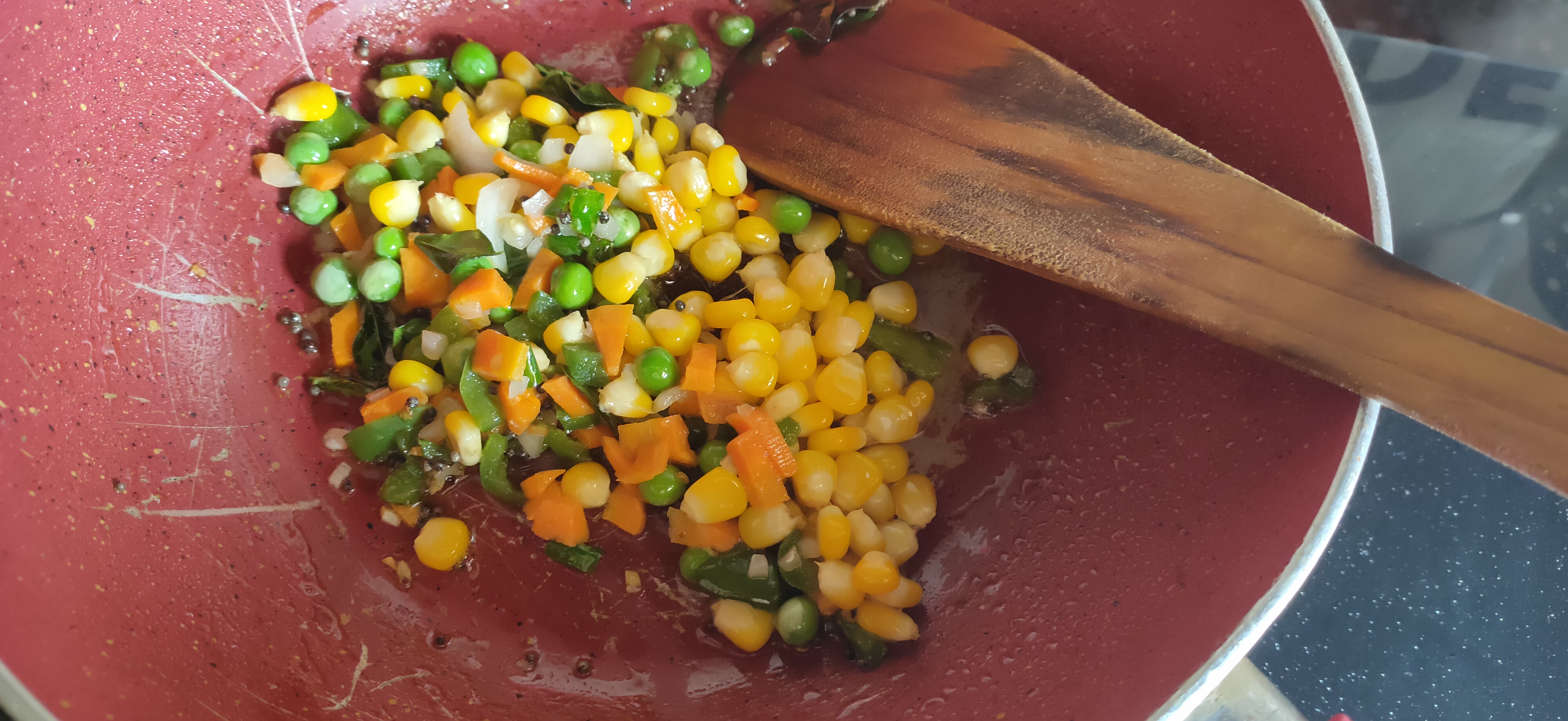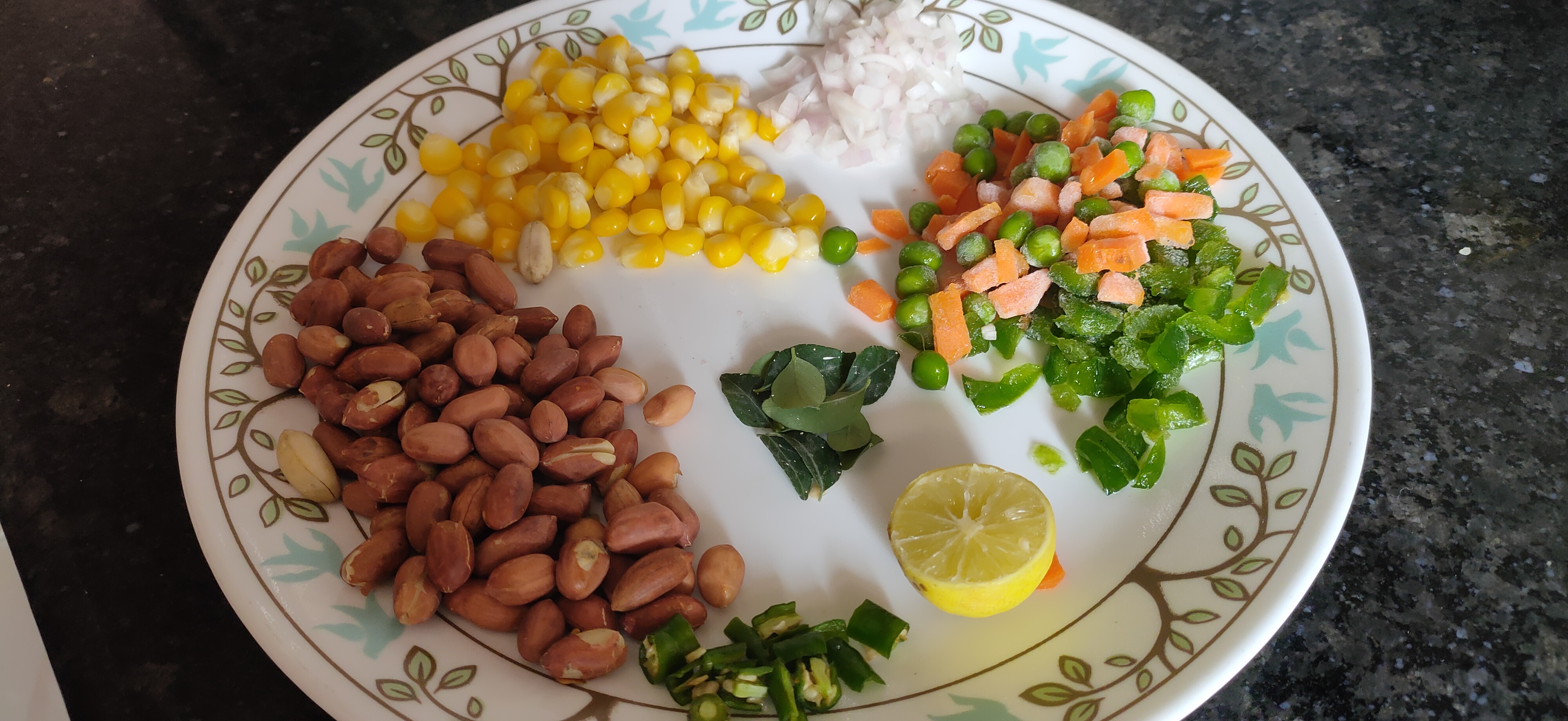 Put the thick bottom pan on flame. Pour oil . When get heated put mustard seeds, kari patta, green chilli. Then saute all the veggies and sweet corn at low flame till 5 mins. Here I took capsicum, carrot, green peas in veggies. Now add poha into these veggies. Now flame will be high, saute properly for 2-3 mins then cover it and leave for 2 more money mins. Now open it and sqeeze lemon on poha and saute. Poha is ready now season it with jeerawan( special masala). If you don’t have jeerawan you can put chaat masala. Garnish it with chopped onion, corriander leaves and peanuts. Serve it with hot ginger masala tea.