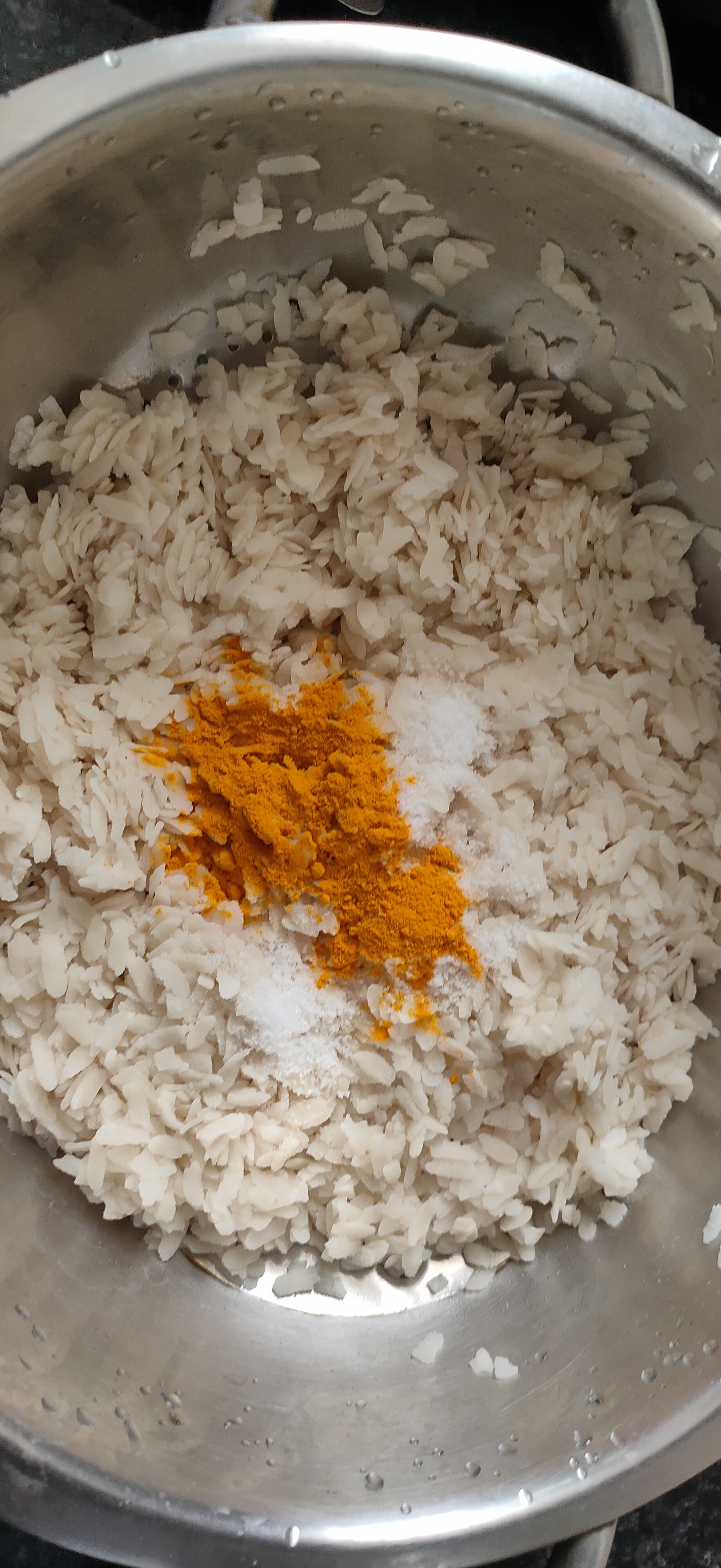Wash poha properly and leave it in a sieve . On poha put salt and turmeric powder.