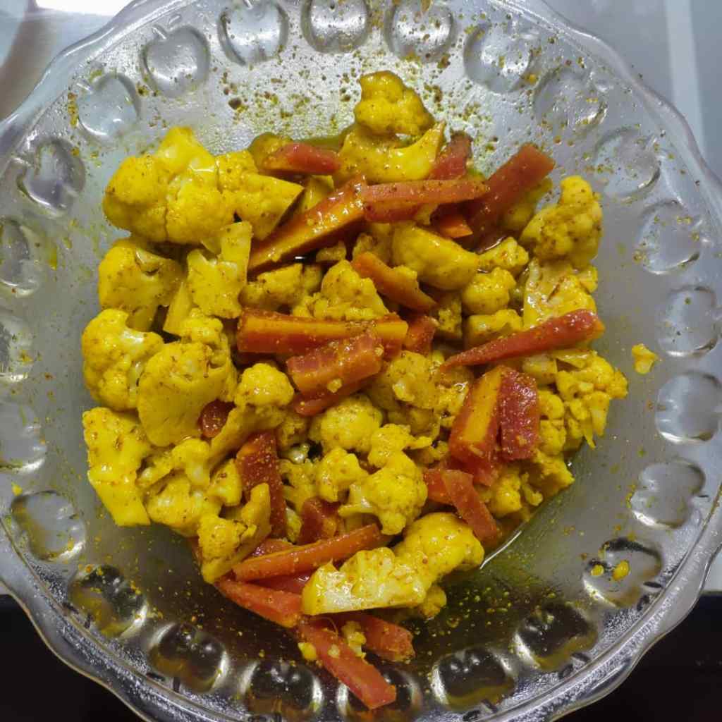 Cut all the veggies roughly. Boil 1 ltr water and switch off the flame. Put all the veggies into boiled water and cover the pan for 10 mins. After 10 mins strain water and tap dry all the veggies into the clean piece of cloth. Now add all the ingredients and mix well into glass bowl. Now cover the bowl and keep it at some warm place for 2 days. Stir these vegetables in 3-4 hours. After 2 days pickl will be ready to eat. Preparation time depends upon how much cold the weather is. More cold more time to get ready.